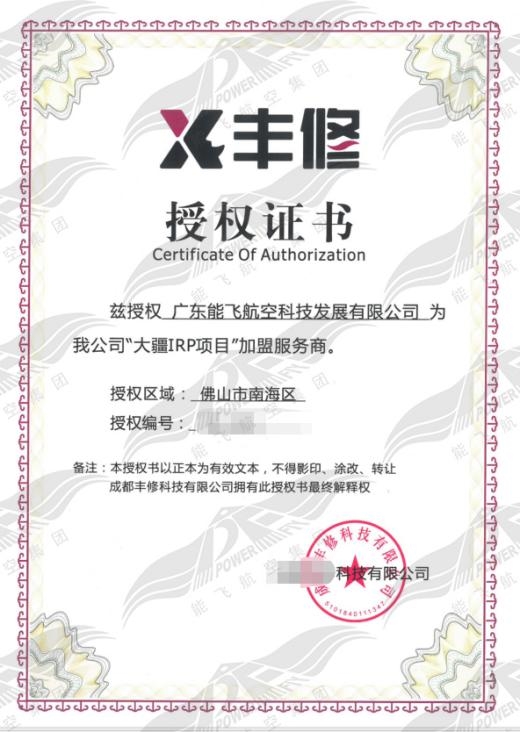▲ 丰修“大疆IRP项目”加盟服务商授权证书